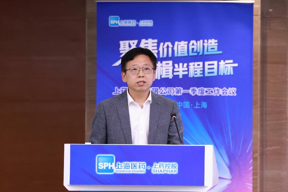 上藥控股戰(zhàn)略創(chuàng)新部總經(jīng)理黃文爭作《一季度重點工作進展》報告